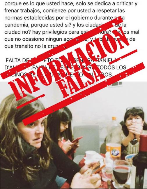 "Funcionara Municipal CONOCIDA en el ámbito político,  su nombre es Daniela D'Amico actualmente Concejal de UCR (Unión Cívica Radical) en juntas los fines de semana rompiendo no solo la cuarentena sino que también, personas en juntas familiares (mas de 10 personas) hasta altas horas de la noche incumpliendo otra norma que es poder circular hasta las 01am. No solo eso si no que también, como pueden apreciar en la foto ingiriendo ALCOHOL, sabemos que la señora D'AMICO es "conocida" por intervenir siempre en algunos casos por supuesto incumplimiento queriendo quedar como la persona que respeta a raja tabla las normas, pero acá esta claro que no respeta absolutamente nada y solo es una pantalla todo su discurso", rezaba la denuncia pública, acompañada de una fotografía en que se la podía ver a la edil compartiendo una reunión familiar, con una copa llena de vino.