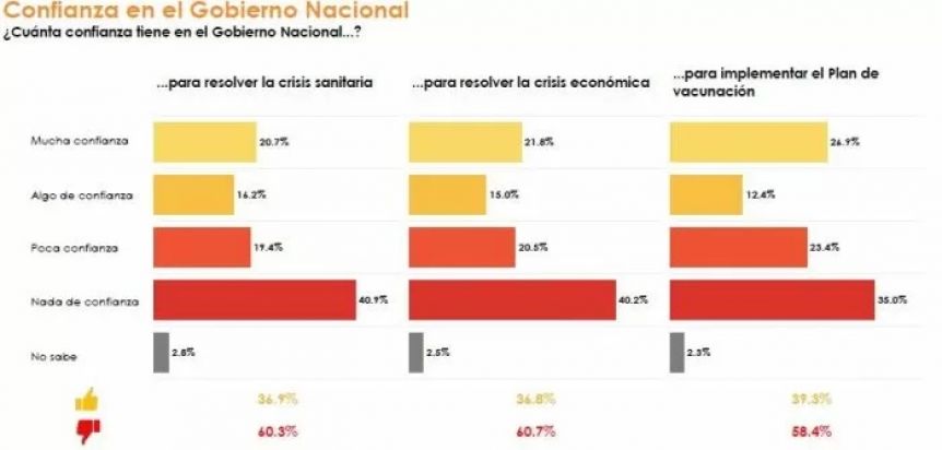 En cuanto a la situación sanitaria, el 60, 3 por ciento sostuvo que no, contra un 36, 9 que afirmó que sí; respecto a la economía, la desconfianza ascendió a 60, 7 contra un optimismo de 36, 8. Finalmente, la vacunación tuvo una observación negativa menor (58, 4 versus 39,3).