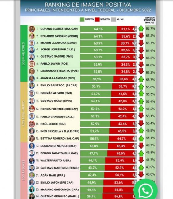 Al final de la table entre los 25 intendentes con mejor imagen positiva del pais, se encuentra Mariano Gaido, de Neuquén, con un 40,7%. en el lugar número 23. Seguido por Gustavo Gennusso, de Bariloche, con un 39,4% de positividad.