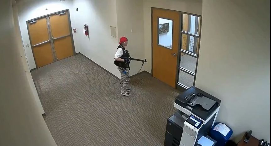 Hale, que vestía un pantalón camuflado, una remera blanca, un chaleco negro y una gorra roja, portaba un rifle semiautomático, otro colgado de un barazo y, además, una pistola. Una vez dentro del colegio, recorre todos los pasillos vacíos del edificio y entra a diferentes salones.