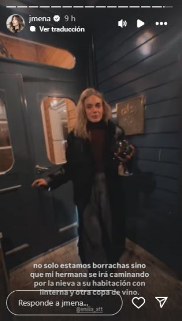 “No sólo estamos borrachas, sino que mi hermana se irá caminando por la nieve a su habitación con linterna y otra copa de vino”, escribió “La Cobra” en la historia que subió este lunes por la noche y en el que se escucha la risa de ambas; mientras Emilia cuenta que tiene que caminar "un kilometro y medio" hasta llegar a su cabaña.