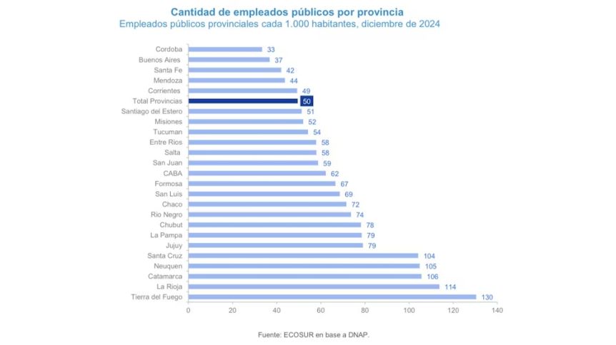 “Estas diferencias responden tanto a factores estructurales (como la densidad poblacional o la estructura productiva), como a las decisiones adoptadas por los gobiernos provinciales a lo largo del tiempo. Provincias menos pobladas, como las patagónicas, La Rioja o Catamarca, registran una elevada cantidad de empleados públicos por habitante, pero también se destacan otras del norte y noreste argentino que, pese a tener mayor densidad poblacional, mantienen una fuerte presencia del Estado como empleador”, describió el informe.