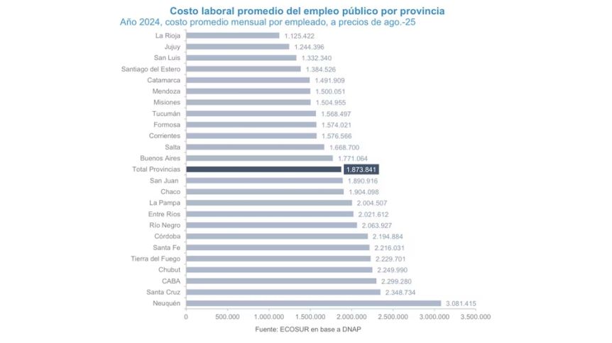 Dicho eso, Neuquén se ubicó en el primer lugar de la lista con un costo laboral estimado de $3.081.415. En segundo lugar se posicionó Santa Cruz, que registró una cifra de $2.348.734. Chubut, por su parte, se estacionó en la tercera ubicación con un monto de $2.249.990, mientras que Río Negro quedó octavo en la lista ($2.063.927).