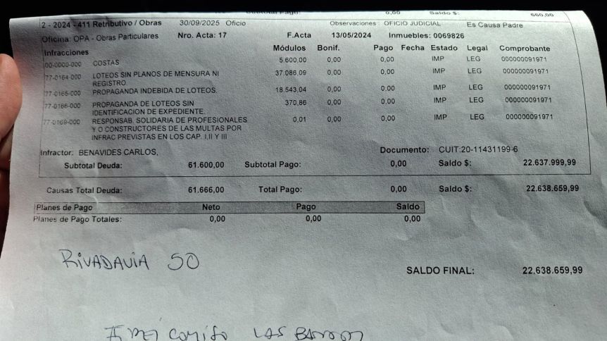 El 30 de septiembre de 2025, la municipalidad le aplicó una multa a Carlos Benavídez por más de 22 millones de pesos por incurrir en los siguientes incumplimientos: “loteos sin planos de mensura ni registro”, “propaganda indebida de loteos”, “propaganda de loteos sin identificación de expediente” y “responsabilidad solidaria de profesionales y o constructores de las multas por infracciones”.
