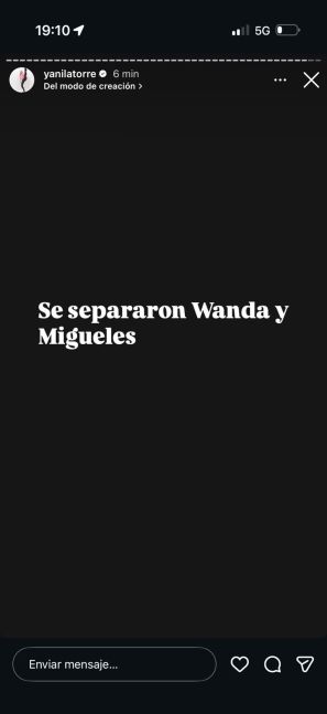 “Se separaron Wanda y Migueles, lo dejó ella. No le cree nada. Tengo todo el cuento”, adelantó Latorre en sus historias de Instagram, mientras disfrutaba de sus vacaciones. Posteriormente, en su programa, profundizó en los motivos: el quiebre se produjo hace aproximadamente una semana en Punta del Este, cuando salió a la luz un escándalo involucrando a la modelo y vedette Claudia Ciardone.