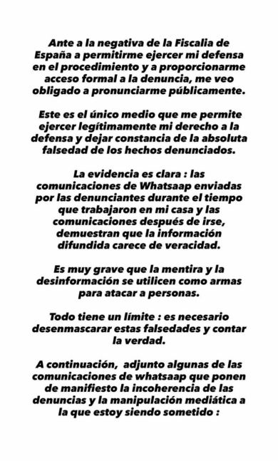 Ante la decisión de la Fiscalía española de mantener la investigación en fase preliminar y no permitirle personarse ni acceder al expediente, Iglesias optó por defenderse en redes sociales: “Ante la negativa de la Fiscalía de España a permitirme ejercer mi defensa en el procedimiento y a proporcionarme acceso formal a la denuncia, me veo obligado a pronunciarme públicamente”.