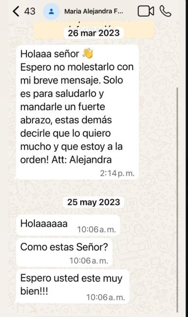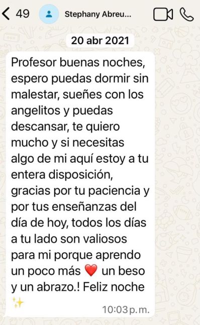 Uno de los fragmentos más destacados data del 20 de abril de 2021: “Profesor buenas noches, espero puedas dormir sin malestar, sueñes con los angelitos y puedas descansar, te quiero mucho y si necesitas algo de mí aquí estoy a tu entera disposición, gracias por tu paciencia y por tus enseñanzas del día de hoy, todos los días a tu lado son valiosos para mí porque aprendo un poco más. Un beso y un abrazo. Feliz noche”.