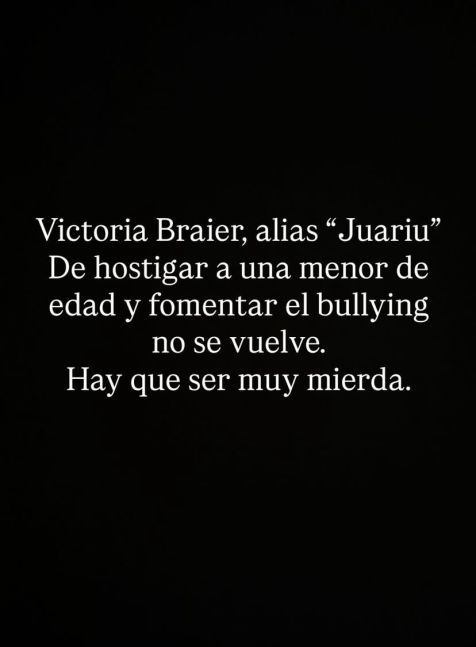 En sus historias de Instagram, la actriz no escatimó palabras: “Victoria Braier, alias ‘Juariu’. De hostigar y fomentar el bullying no se vuelve. Hay que ser muy mierda”. La acusó directamente a la periodista de promover el acoso, enfocándose en cómo las publicaciones involucraron a menores y detalles privados de su vida familiar.