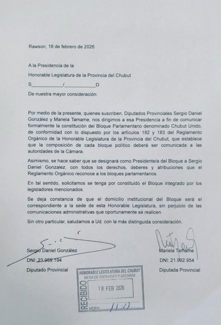 Dos diputados que integraban la bancada oficialista, Sergio Daniel González y Mariela Alejandra Tamame, formalizaron hoy la constitución de un nuevo bloque parlamentario denominado Chubut Unido en la Honorable Legislatura