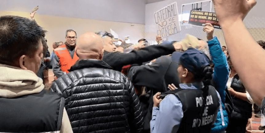 Durante el discurso del intendente Walter Cortés, un chofer le pegó una piña a una mujer que se manifestaba contra los cambios en el cerro Catedral. La Defensora del Pueblo inició una investigación de oficio y la concejal Julieta Wallace repudió los hechos