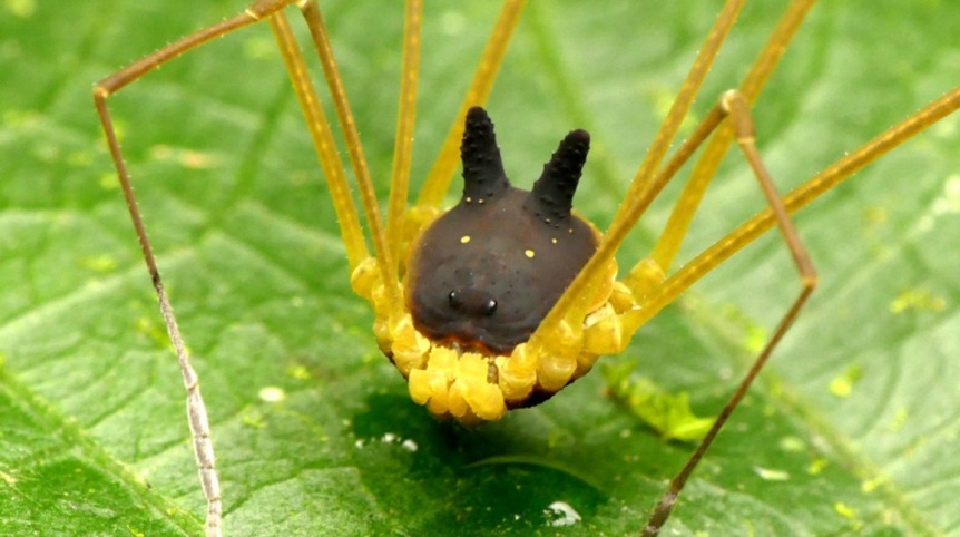 This is not a photoshopped image. This is a real photo of an actual living arachnid, a cousin of spiders, called the bunny harvestman (Metagryne bicolumnata)
