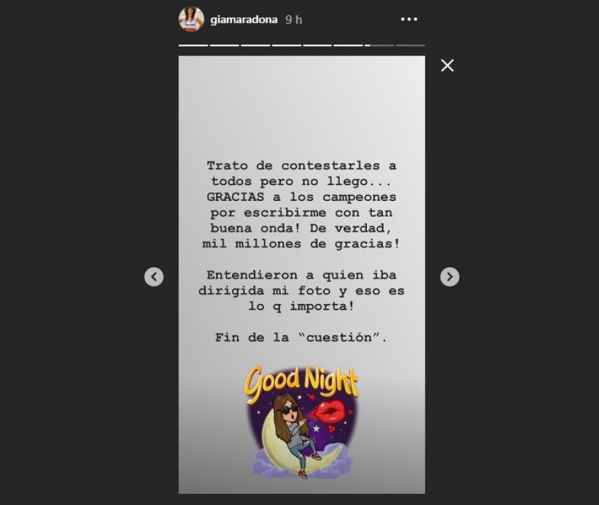 Tras la respuesta, la hija del diez recibió miles de burlas y críticas, por lo que atendió a cada uno y con una contundente imagen dio por cerrada la discusión. Con una foto de su cola y tres corazones azul y amarillo Gianinna escribió: “Por acá me paso todos los festejos y comentarios gallinas”.