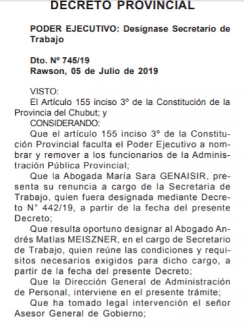 La designación fue oficializada en el Boletín Oficial el pasado 12 de julio bajo el decreto 745/19.