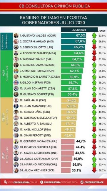 La Consultora Opinión Pública CB elabora todos los meses un estudio de la imagen positiva de los 24 mandatarios provinciales.