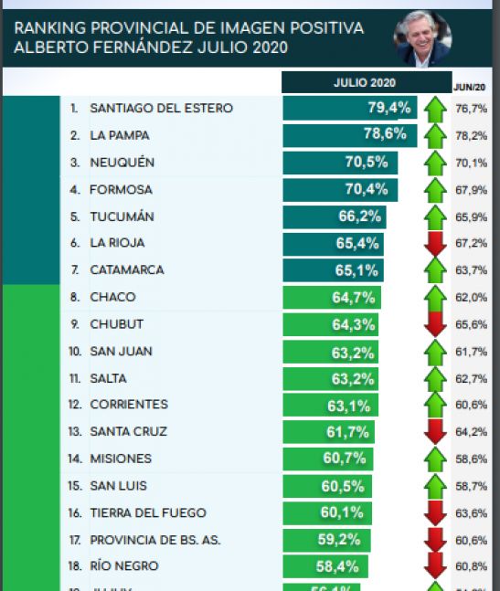 Por su parte, el presidente Alberto Fernández posee su imagen positiva más alta en la Provincia de Santiago del Estero (79,4%) y su imagen positiva más baja en la Provincia de Mendoza (41,2%). En donde más aumentó su imagen positiva con respecto al mes anterior es Santa Fe (+ 4,2 puntos), mientras que en Ciudad de Buenos Aires es donde más bajó su imagen positiva con respecto al mes de Junio (- 7,4 puntos).
