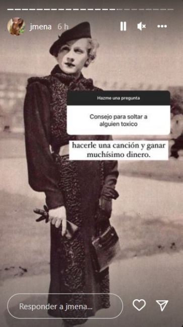 A través de su cuenta de Instagram, la artista dialogó con sus seguidores y contestó sus inquietudes. Una de sus fanáticas le pidió ayuda para olvidarse de una relación no sana y la intérprete fue contundente. “Consejo para soltar a alguien tóxico”, le escribieron. Fiel a su humor característico, la actriz recomendó: “Hacerle una canción y ganar muchísimo dinero”.