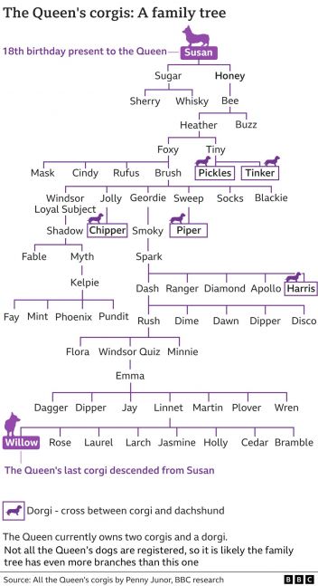 La BBC compartió el árbol de todas las mascotas que acompañaron durante los últimos 70 años a la familia real. Actualmente Candy es la última de la generación que se encuentra con vida. Mientras que de todos, Willow, fue uno de los pocos que tuvo trascendencia internacional luego de su aparición en la ceremonia de apertura de los Juegos Olímpicos de Londres en 2012. Tras el fallecimiento de la monarca, sus mascota quedarán a cargo del rey Carlos III.