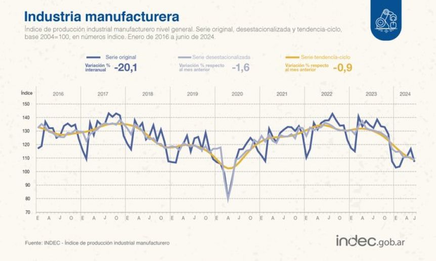 En junio de 2024, la industria manufacturera argentina experimentó una caída significativa según el reciente informe del INDEC. El Índice de Producción Industrial Manufacturero (IPI manufacturero) mostró una disminución del 20,1% en comparación con el mismo mes del año anterior. Además, el acumulado de enero a junio de 2024 presentó una caída del 16,1% respecto al mismo período en 2023, lo que refleja un deterioro profundo y sostenido en la actividad industrial del país.