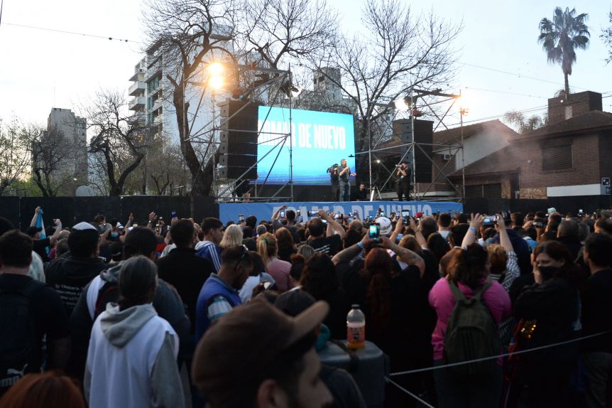 Luego del video proyectado subió al escenario Máximo Kirchner y hablo para los más de seis personas presentes con el tema “jijiji” de los Redonditos de Ricota frente a una bandera que flamea “Nada sin Cristina”.