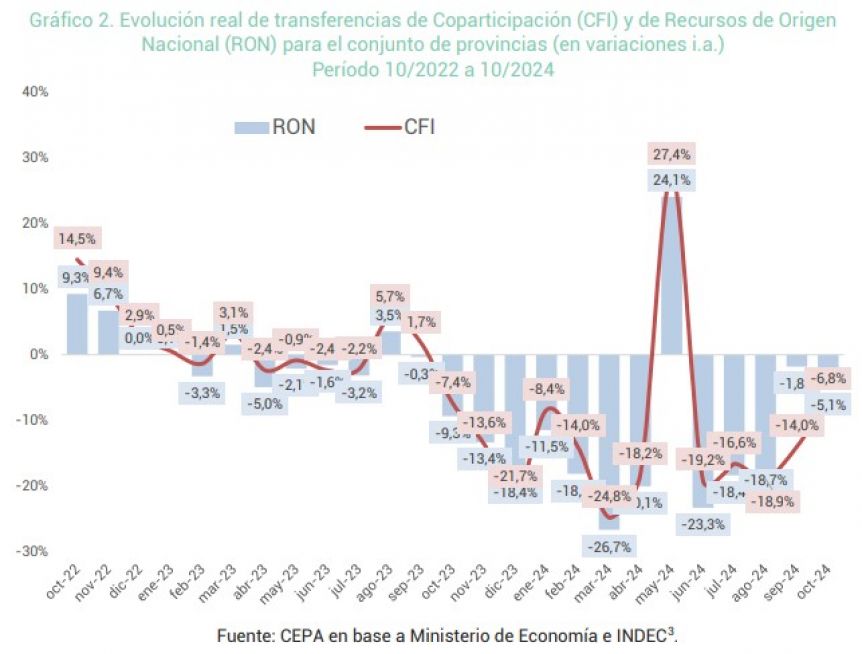 El promedio de todas las provincias da una caída en octubre de 2024 del 5,1% en los RON, y un 6,8% interanual en términos de CFI. El informe del CEPA señala que el 2022 fue el último año de crecimiento real de estos ingresos, mientras que el 2023 fue un año de estancamiento, y en lo que va del 2024 se registran 10 meses de derrumbe ininterrumpidos.