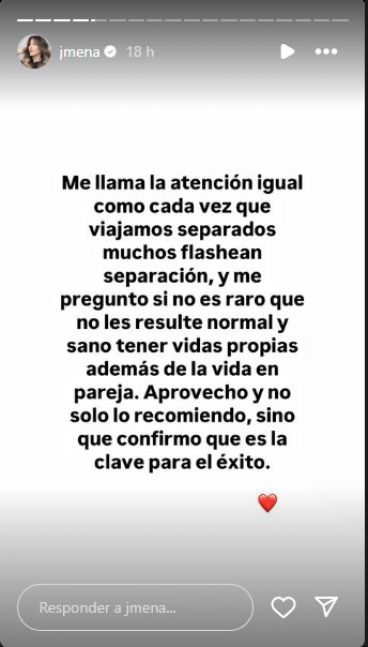 “Me llama la atención como cada vez que viajamos separados muchos flashean separación y me pregunto si no es raro que no les resulte normal y sano tener vidas propias además de la vida en pareja. Aprovecho y no solo lo recomiendo, sino que confirmo que es la clave para el éxito”, sentenció Jime.