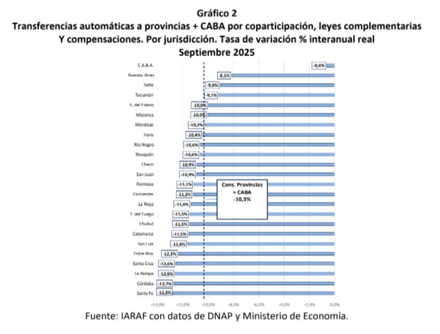 Según el último informe de IARAF, las transferencias automáticas a provincias en septiembre habrían tenido una caída del 10% real interanual, debido principalmente a la recaudación del impuesto a los Bienes Personales. Los datos en las jurisdicciones de la región