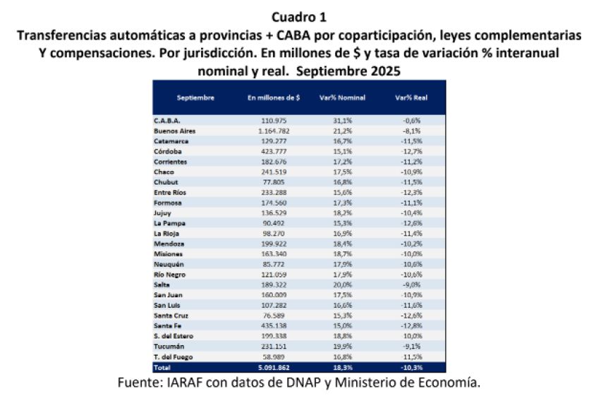 “En el mes de septiembre de 2025, el Gobierno nacional envió al consolidado de provincias más CABA $5.091.000 millones en concepto de coparticipación, leyes especiales y compensaciones, frente a $4.305.000 millones enviados durante igual período del año anterior. Es decir que se observó una variación nominal del 18,3%. Descontando el proceso inflacionario del período, esto se traduciría en una baja real del 10,3%. Por su parte, la coparticipación, es decir las transferencias automáticas menos leyes complementarias y compensaciones, habrían descendido un 0,8% real”, detalle el informe en primer lugar.