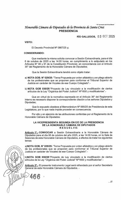 El gobernador Claudio Vidal convocó a una sesión extraordinaria este lunes 6 de octubre a las 14.00, con el objetivo de que se debata la reincorporación de Eduardo Sosa como Procurador General de la Provincia, quien fue removido de su cargo por una reforma de 1995, bajo el mandato de Néstor Kirchner. Es en el marco de la batalla que libró el Ejecutivo con el Poder Judicial
