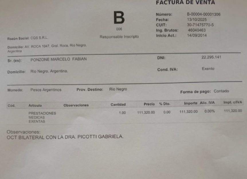 La denuncia fue acompañada por una factura del Centro Quirúrgico del Sur de General Roca, emitida a nombre de Picotti por un monto de 111.320 pesos, en la que se consigna la prestación de un “Oct. bilateral con la Dra. Picotti, Gabriela”.