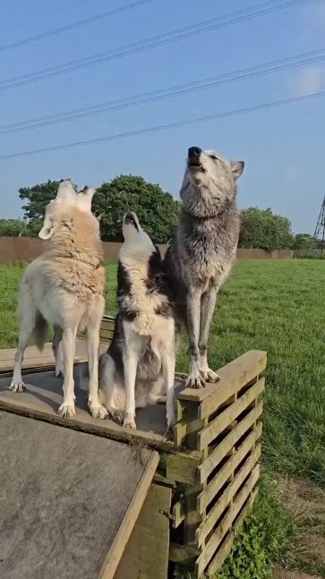 Este perro siberiano se encontró con dos lobos y quiso animarse a aullar como ellos. La diferencia es notable, pero la intención es lo que cuenta.