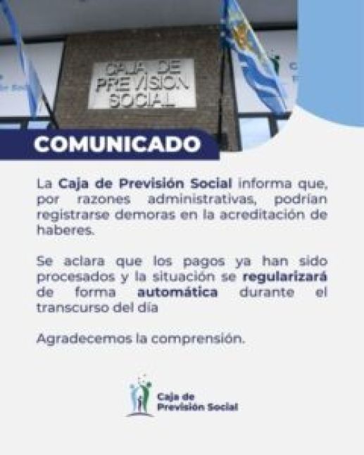 La Caja de Previsión Social (CPS) emitió un comunicado para explicar lo sucedido y tranquilizar a los titulares de prestaciones. Desde la entidad señalaron que los pagos ya fueron procesados en tiempo y forma, pero que podría existir una demora en la acreditación bancaria debido a cuestiones administrativas y operativas del sistema financiero.
