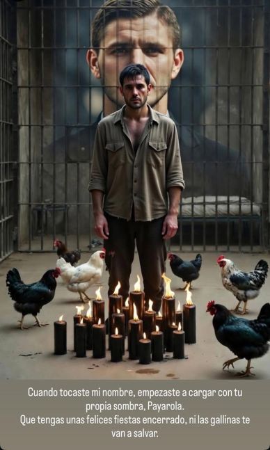 Como cierre, el futbolista compartió una imagen generada por inteligencia artificial que muestra a un hombre en una celda rodeado de velas negras y gallinas, con su propio retrato al fondo, acompañada del mensaje: “Cuando tocaste mi nombre, empezaste a cargar con tu propia sombra, Payarola. Que tengas unas felices fiestas, encerrado ".