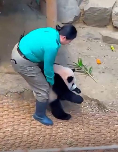 La ternura del oso divirtiéndose a pesar del trabajo de la cuidadora. El animalito está rodando, y explorando con energía