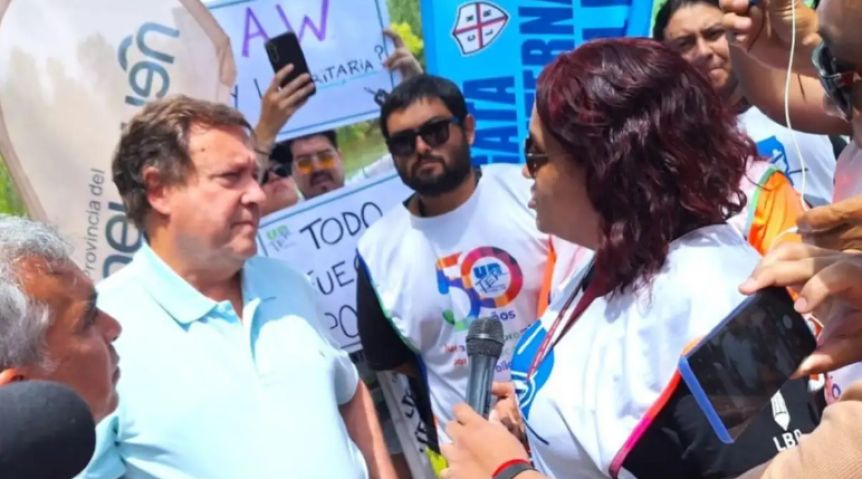 El gobernador de Rio Negro fue abordado por la secretaria general de del gremio, Laura Ortiz, quien le entregó un petitorio exigiendo la apertura de las paritarias salariales. El cruce se produjo en un momento de gran visibilidad, con autoridades provinciales y deportistas presentes en la ceremonia de largada