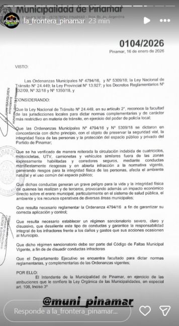 La medida busca desalentar conductas peligrosas, reducir la siniestralidad y preservar la seguridad de residentes y turistas, así como el delicado ecosistema de la zona costera en plena temporada alta. El decreto quedó dictado ad referéndum del Honorable Concejo Deliberante de Pinamar.