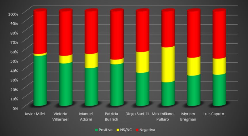 La principal competidora de Milei, dadas las circunstancias, está (al menos formalmente) dentro de su gobierno. Se trata de la vicepresidenta Victoria Villarruel, quien sigue gozando de una buena percepción pública, superando al jefe de gabinete, Manuel Adorni. Con sólo 2 puntos de diferencial negativo, es la figura del gobierno con mayor aceptación aparte del propio Presidente, y esto a pesar de las fuertes críticas y recortes a su poder realizadas desde distintos sectores del oficialismo.
