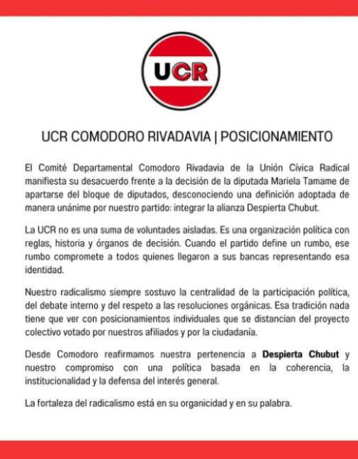 En medio de la reciente división del bloque oficialista en la Legislatura de Chubut, la Unión Cívica Radical del distrito salió a fijar postura y ratificó su respaldo al Gobierno provincial. El partido recordó que forma parte del frente electoral que asumió en diciembre de 2023, tanto a nivel provincial como en varios municipios, y aseguró que mantendrá el rumbo definido por el mandato popular.
