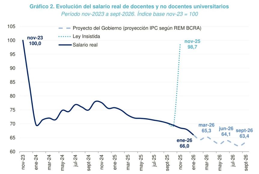 La drástica pérdida de ingresos de los docentes y no docentes universitarios durante el mileísmo se evidencia en un gráfico que, a partir del último tramo de 2025, exhibe la diferencia entre los recursos que deberían asignarse según la ley insistida, los que efectivamente se asignaron y lo proyectado por el gobierno mediante su proyecto de ley alternativa.