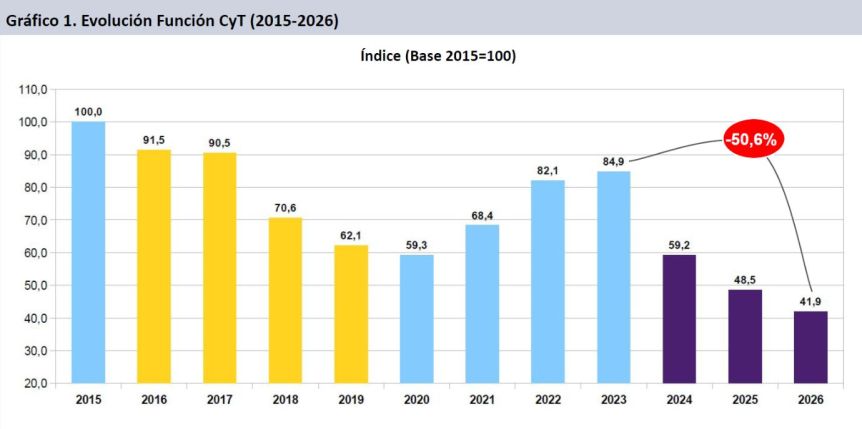La función ciencia y tecnología (FCyT) de la administración pública nacional (APN) “tendría una caída de doble dígito por tercer año consecutivo, en un contexto en el que el Presupuesto total de la APN caerá levemente respecto de los deprimidos valores de 2025”, indica el estudio del Grupo EPC. “El PBI, bajo supuestos optimistas, retomaría la senda del crecimiento sobre todo en el segundo semestre, luego del incremento del nivel de actividad en 2025 mayormente por arrastre estadístico, y tras un 2024 muy difícil. De esta manera la FCyT tendría caídas reales en ocho de los últimos once años.”