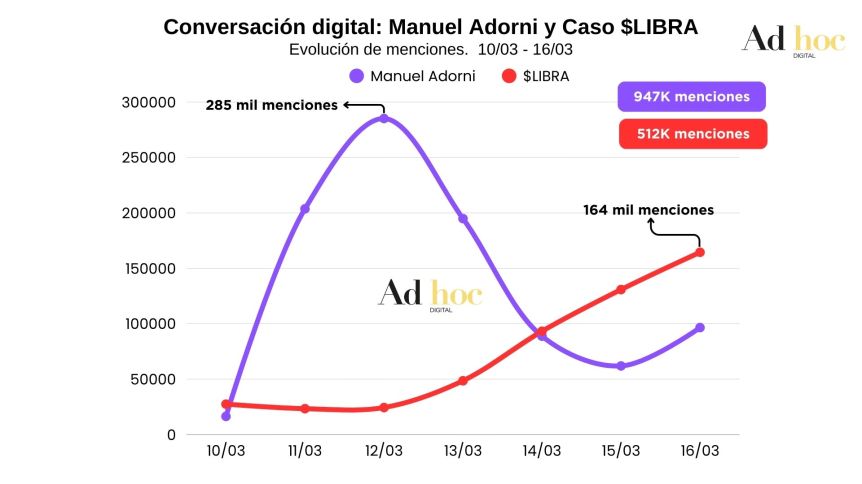 De acuerdo con el informe, en los últimos siete días el vocero presidencial Manuel Adorni acumuló alrededor de 947 mil menciones dentro de la conversación digital vinculada al Gobierno. Sin embargo, el caso LIBRA volvió a captar gran parte de la atención pública, con unas 164 mil menciones registradas solo durante la jornada del lunes.