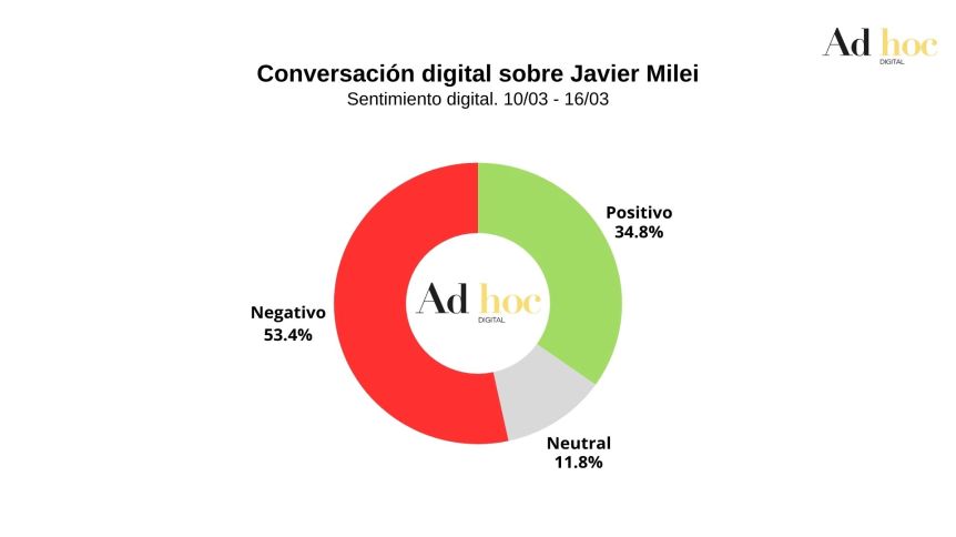 En términos de percepción pública, el relevamiento muestra que el sentimiento digital hacia Milei presenta una tendencia negativa. El análisis indica que el 53,4% de las menciones sobre el Presidente en redes sociales tiene un tono desfavorable, mientras que el 34,8% corresponde a comentarios positivos.