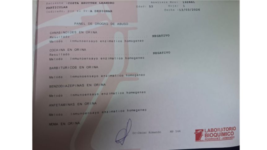 El edil incorporó el estudio al expediente legislativo y explicó que decidió realizarlo por su cuenta en un laboratorio privado, con resultado negativo. “Es importante que quienes votemos este proyecto no estemos condicionados por ningún tipo de dependencia”, sostuvo durante su exposición.