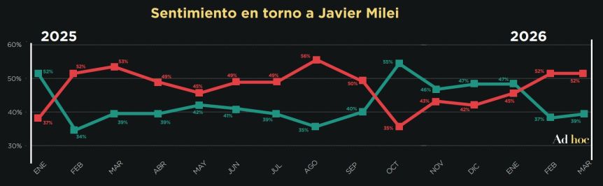 En efecto, el informe más reciente de Ad Hoc revela que el sentiment o disposición anímica hacia el mandatario se volvió fuertemente negativo el mes pasado, con Karina y Adorni como factores que hunden la percepción de la gente respecto de Milei.