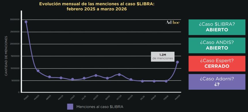 En cuanto al caso Libra, es “un escándalo fuera de escala”, que tuvo el pico mensual más alto desde su surgimiento hace más de un año con la filtración de los audios de Mauricio Novelli, figura central en el esquema.