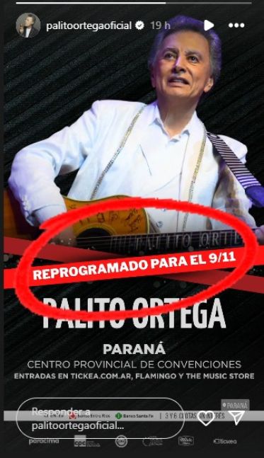 “Por motivos de salud, Palito Ortega se ve en la obligación de postergar el show del domingo 12 de octubre en el Centro Provincial de Convenciones, Paraná. El show se realizará en nueva fecha a confirmar a la brevedad, y las entradas serán válidas para la nueva fecha. Quienes no puedan asistir recibirán el reintegro por las mismas. Disculpas por las molestias”, expresaba el comunicado.