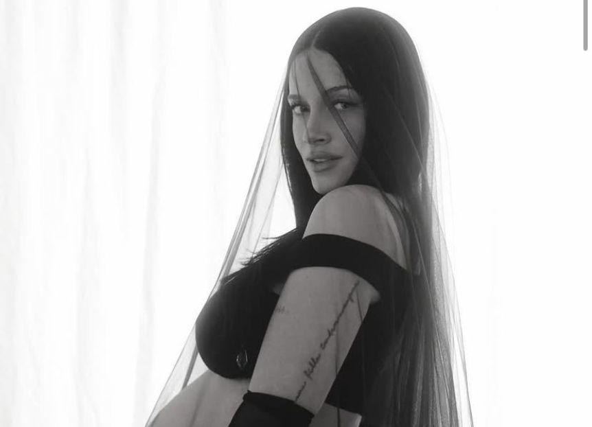 Su estilismo incluye un conjunto minimalista de dos piezas en negro complementado por un velo de tul negro transparente que cae desde la cabeza como una larga cola, evocando una novia oscura y misteriosa. Los guantes largos negros añaden un toque dramático y teatral, fusionando elementos nupciales con un aire ceremonial e introspectivo. Esta elección estética se aleja de las paletas claras y románticas habituales, profundizando en su afinidad por el total black y la moda alternativa, convirtiendo el embarazo en una declaración personal de empoderamiento.