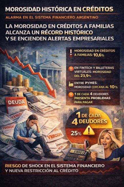 Además, el problema se agrava en el sistema no bancario. Las fintech y billeteras virtuales presentan niveles de mora del 23,9%, más del doble que los bancos tradicionales, en un contexto de tasas de interés mucho más elevadas y acceso más flexible al crédito.
